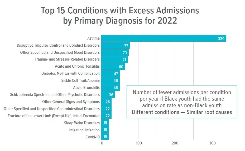Flash to another chart, and glaring racial inequities are documented in terms of how many fewer days of high-cost hospital stays would be required if Black children had the same rate of hospital admissions as non-Black children. It’s not just for admissions; similar inequities are seen for birth outcomes, early child development and kindergarten readiness.