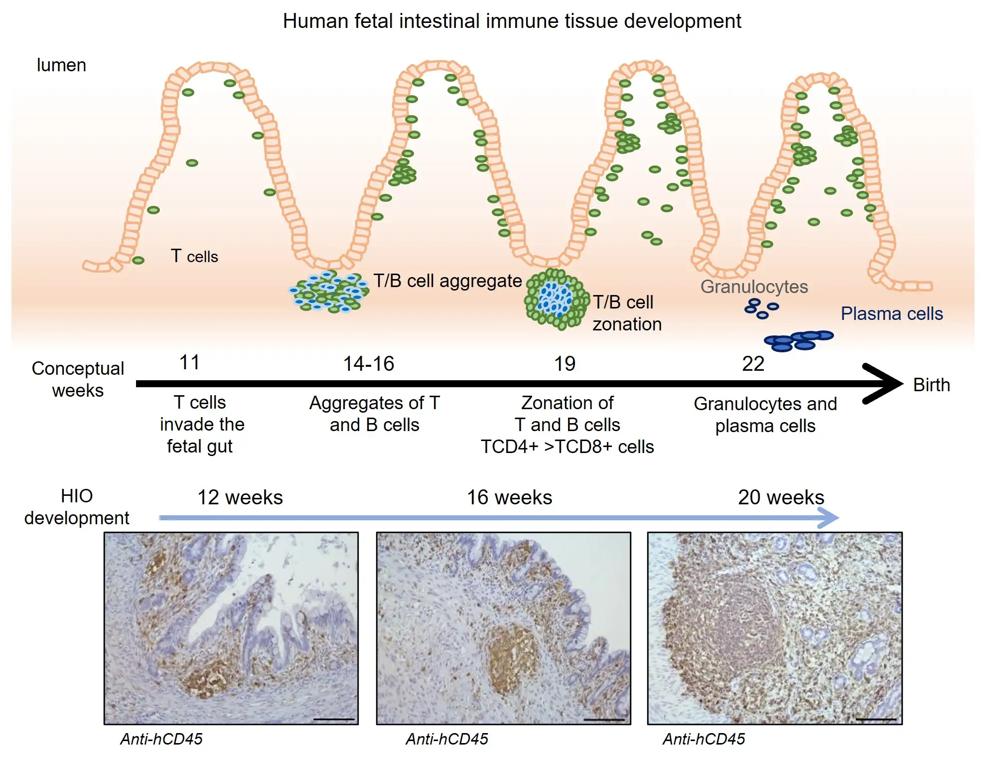 At 12, 16 and 20 weeks, the lab team collected organoids to analyze the types of cells they contained. They found that the organoids contained multiple types of human immune cells that migrated from the humanized mice, including CD45+ cells and important cell formations called gut-associated lymphoid tissue (GALT) structures.