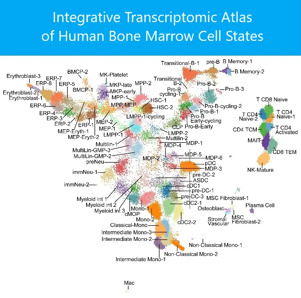 - Identifying 89 clusters by a novel integration of gene expression and surface proteins helped reveal new stem/progenitor cell populations.