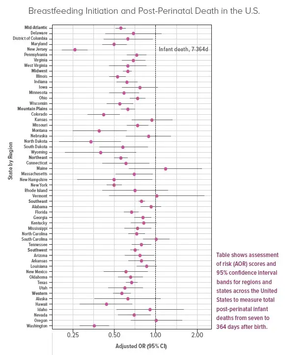 After controlling for factors such as maternal age and education, gestational age, smoking during pregnancy, enrollment in a federal supplemental nutrition program, and race and ethnicity, researchers found that overall, breastfeeding was associated with a 33% reduced risk of infant death from seven to 364 days compared to those who were not breastfed. The Mid-Atlantic and Northeast regions had the greatest post-perinatal infant mortality reductions (44%), while the Southeast had the least reduction (21%). Reduced post-perinatal infant mortality was present in all U.S. regions.