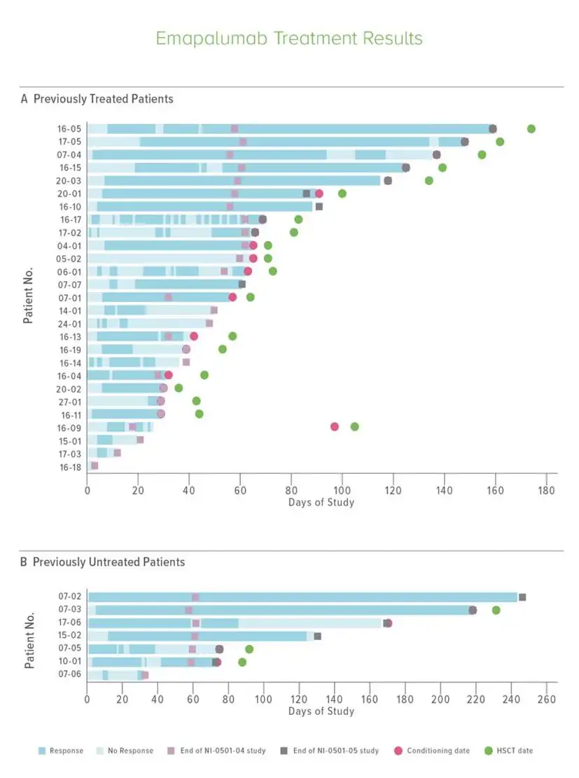 Overall, 34 patients received emapalumab, including 27 who had received other unsuccessful treatments and seven patients who had not been treated in any other way.