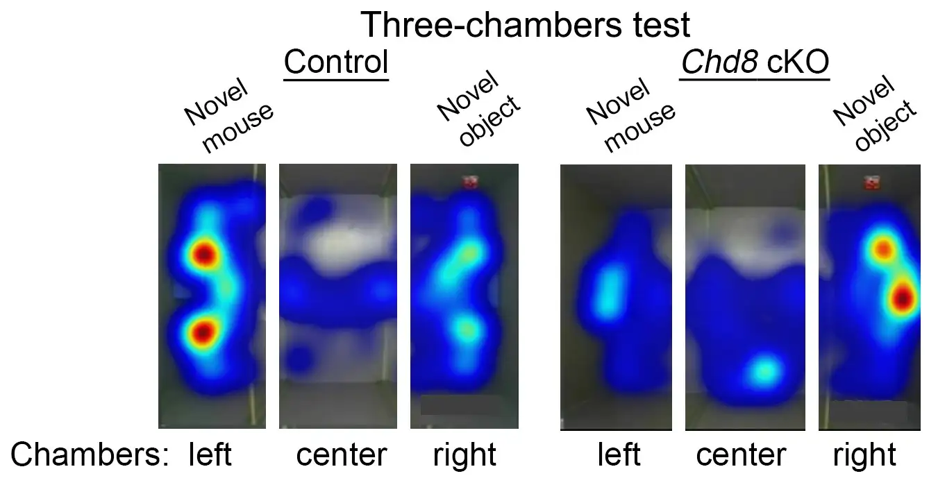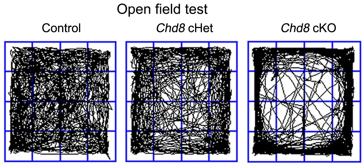 The mice with loss of CHD8 function in the brain develop several classic autistic behaviors, including avoiding others. The effect was striking when mapping the movements of normal control mice and those that had lost CHD8 function as adults.
