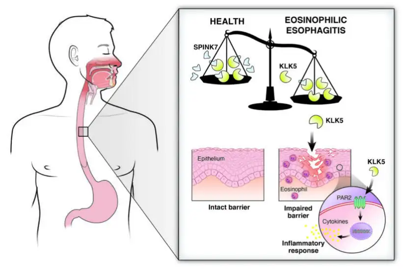 Because foods we eat contain enzymes that can damage human tissue, the lining of the esophagus protects itself by producing its own enzyme inhibitors that prevent degradation of the offending proteins and thus protect the lining. Previously, Rothenberg and colleagues found that SPINK7 is a key contributor to this protective process and was nearly absent in the esophagi of adults and children with EoE. Without SPINK7, cultured esophageal cells lost their normal barrier function that ordinarily helps move food along the digestive tract. Tissues that did not express SPINK7 also produced high levels of chemical messengers called cytokines that attract and activate eosinophils and produce the same type of inflammation seen in allergic diseases.