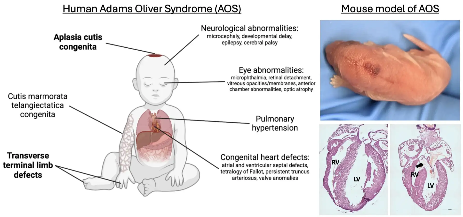AOS is a rare congenital disorder characterized by a thinning or absence of skin and skull tissue at the top of the head, often occurring along with abnormalities affecting the hands and feet. Many born with AOS also have heart and vascular defects and some have neurological defects.