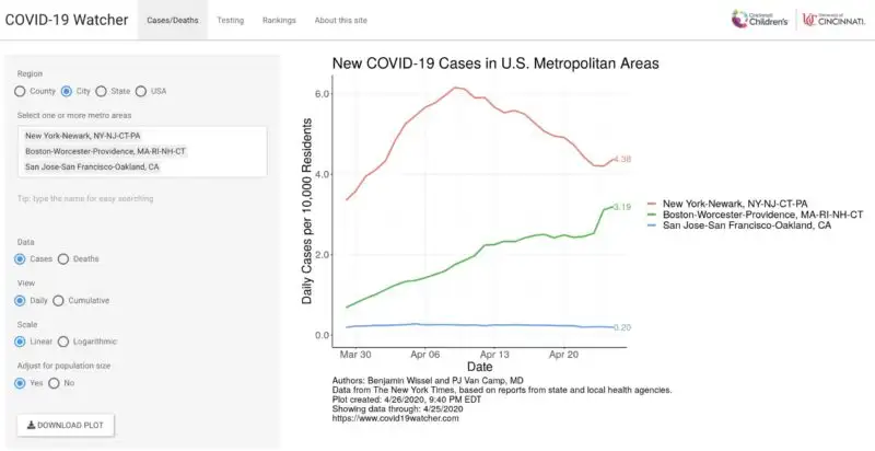 The COVID-19 Watcher, developed by Cincinnati Children’s and University of Cincinnati graduate students Ben Wissel and PJ Van Camp, tracks cases, deaths, testing volumes, and rankings to inform people of outbreaks in their area.