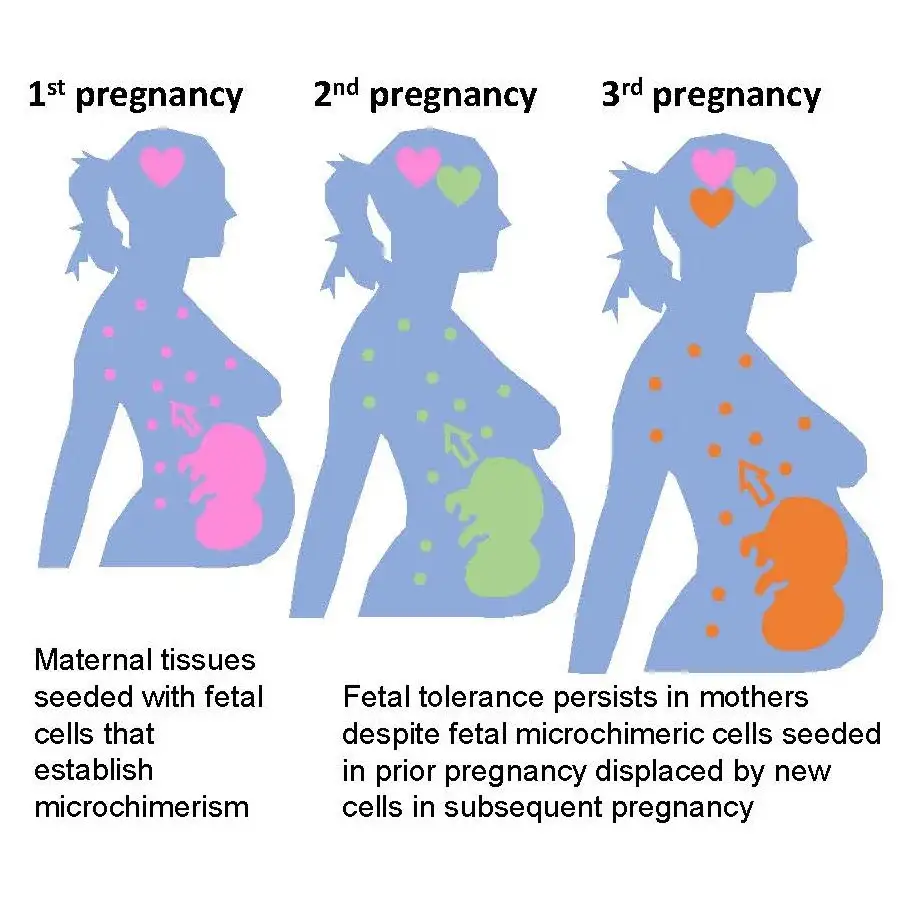 Fetal microchimeric cells remaining in mothers from a first pregnancy get displaced by new fetal cells when mothers become pregnant again. Meanwhile, once a grown daughter becomes pregnant, fetal microchimeric cells displace maternal microchimeric cells causing her to immunologically “forget” her mother.