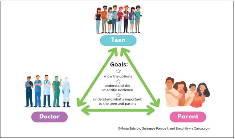 - Trusting relationships are foundational for effective triadic shared decision making. Families value clear explanations, direct engagement with adolescents, and reassurance that choices can be revisited over time. Families and clinicians felt these behaviors could help reduce anxiety, build confidence, and ensure all members of the triad feel heard and supported.