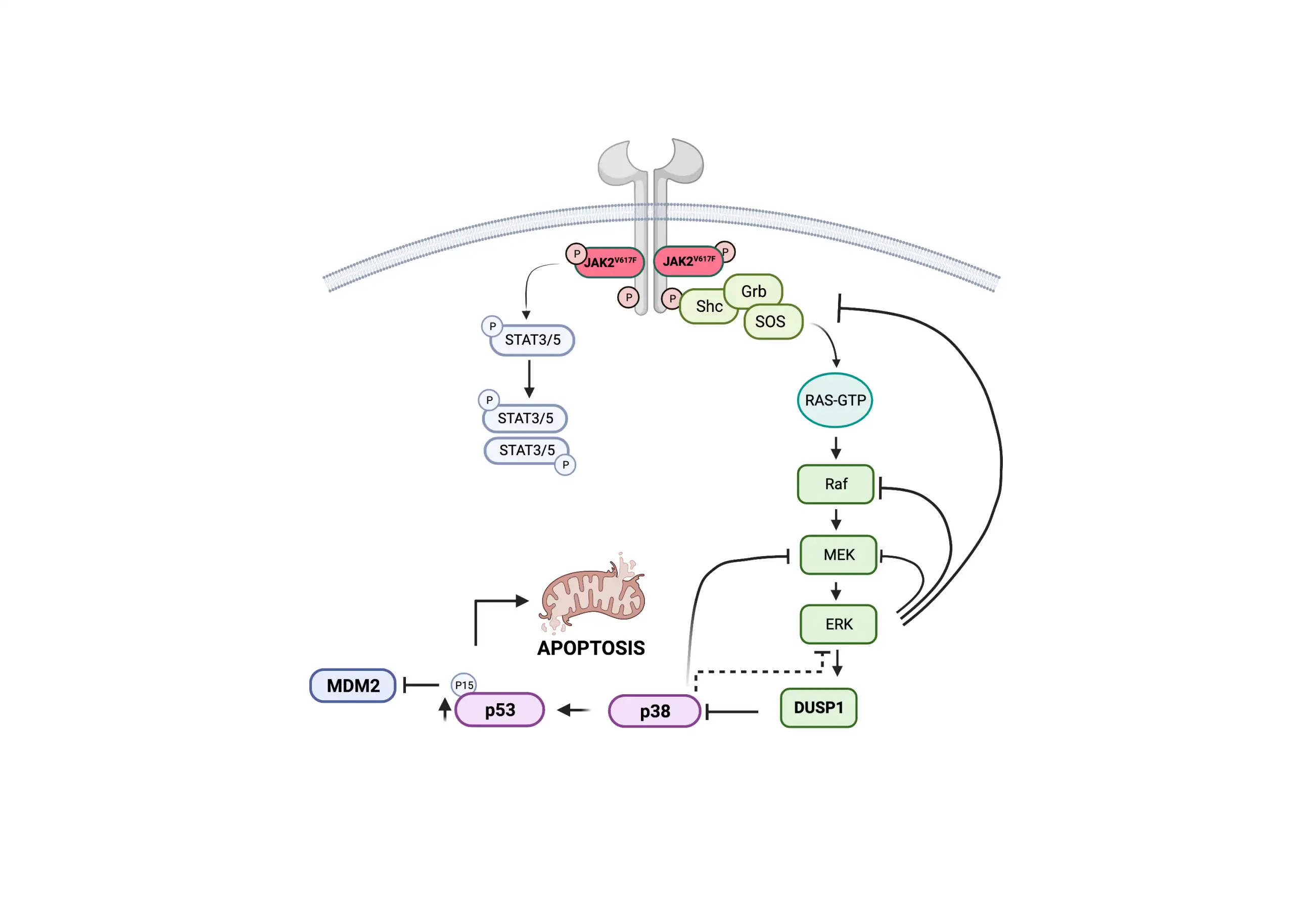 “In essence, inflammatory cytokine and JAK2V617F signaling converge to induce the expression of DUSP1, which prevents the function of P53.” (See figure)