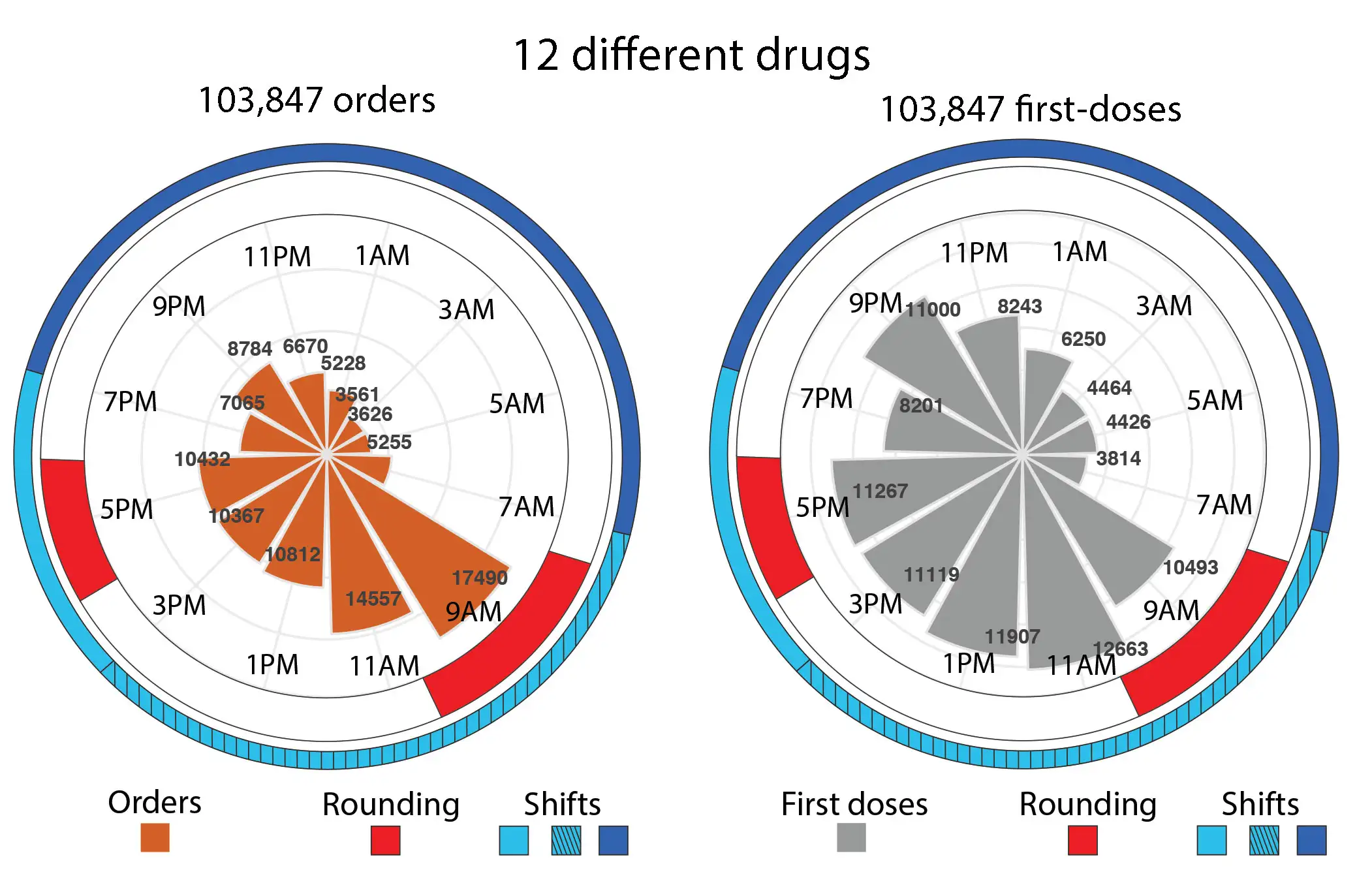 “For every drug, order times were time-of-day−dependent, with morning-time surges and overnight lulls. These rhythms corresponded to shift changes and rounding times,” the co-authors state.