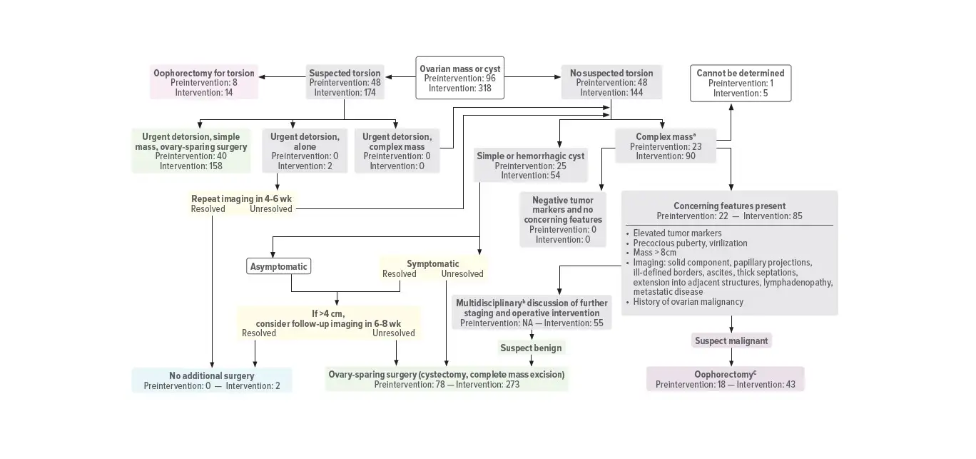 The study included 519 patients aged 6 to 21 years who received surgery for an ovarian mass at one of 11 participating children’s hospitals between August 2018 and January 2021. The surgical teams conducted a standardized set of evaluations including medical history and physical examination, imaging studies, and serum tumor markers to stratify risk. In a previous single-site study, this algorithm reduced unnecessary oophorectomies from 72% to 4.6% with no missed malignancies. In this larger, multicenter cohort, the percentage of unnecessary oophorectomies decreased from 16.1% to 8.4%.