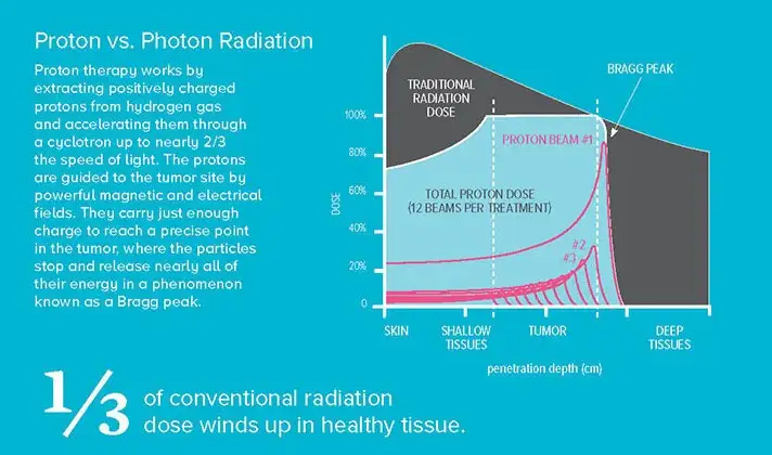 Proton therapy reduces risk by sending particles into the body at relatively low levels of radiation, which then stop within the targeted tissue to release nearly all their energy in a spike of output known as a Bragg peak. The photon energy from conventional X-ray beams passes all the way through tissue, killing the targeted cancer cells but also damaging healthy tissue on the way in and out. View an animation of how Proton Therapy works for cancer treatment.