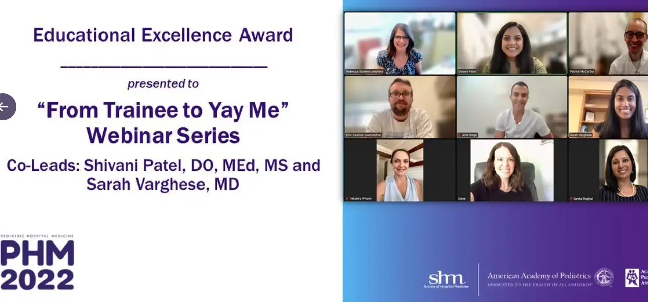 Shivani Patel, DO, MEd, MS, (shown middle top row) received the Educational Excellence Award as co-leader of the “From Trainee to Yay Me” webinar series.